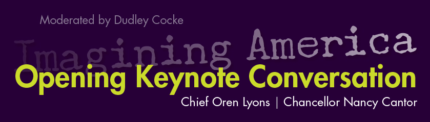 So we're going to really be emphasizing what we can do, what we can do. How we can fortify what we're already doing, and how we can find new things to do together. So that is the call to action that we've all come here for. Now on the note of democracy, we have two champions of democracy with us here this morning: President and Chancellor of Syracuse University, Nancy Cantor, and Chief Oren Lyons. Now, Chief Oren Lyons is the Faith Keeper. We need to keep the faith, people. He is the Faith Keeper of the Turtle Clan of the Onondaga Council of Chiefs of the Haudenosaunee Confederacy. So let's welcome Chief Lyons and Chancellor Cantor, and we're going to get this conversation going.