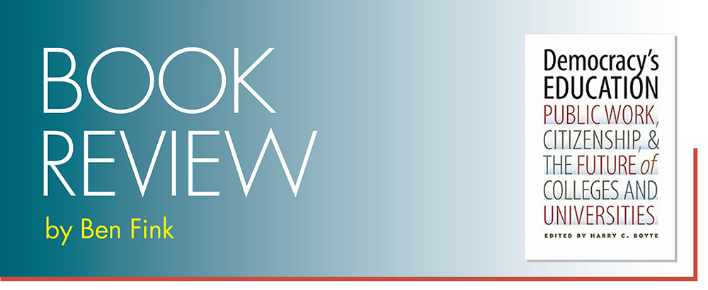Democracy's Education: Public Work, Citizenship, and the Future of Colleges and Universities, a compilation of new essays about public work in higher education edited by Harry C. Boyte, often feels like it was written explicitly for readers of Public. And in a way, it was. Among its wide roster of contributors are Imagining America codirectors Timothy K. Eatman and Scott J. Peters, who contribute excellent pieces on the work life of academics and on the democracy's college tradition, respectively; assistant director Jamie Haft, who offers valuable insight into the public education and miseducation of young artists; and Boyte himself, whose historical and theoretical formulations frame the book and its arguments, and who often works closely with Imagining America and its leaders. In addition, several authors discuss Imagining America directly: two examples are Rutgers University-Newark chancellor Nancy Cantor, who describes IA's work in promoting public humanism and countering the notion that academics are "talkers not listeners" (77); and University of Pennsylvania doctoral student Cecilia M. Orphan, who describes IA's role in developing new models of graduate student socialization that would encourage rather than discourage public work.