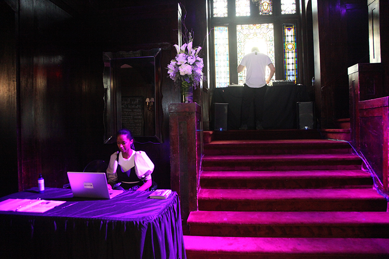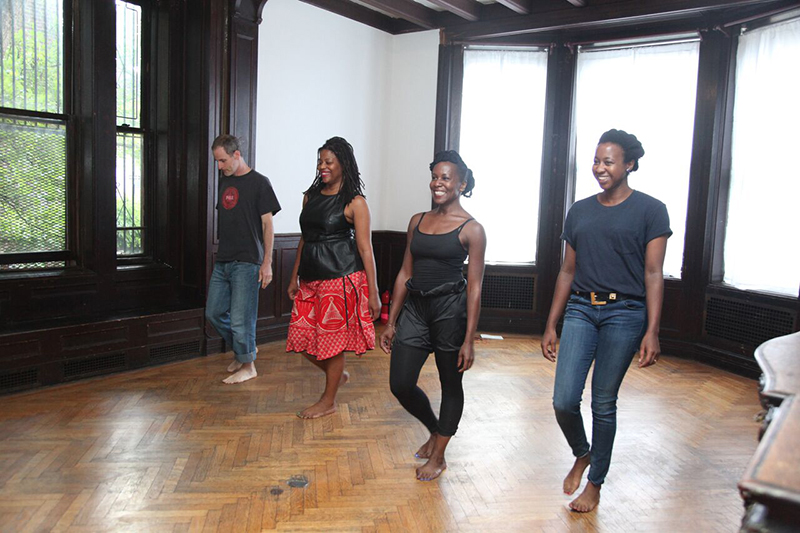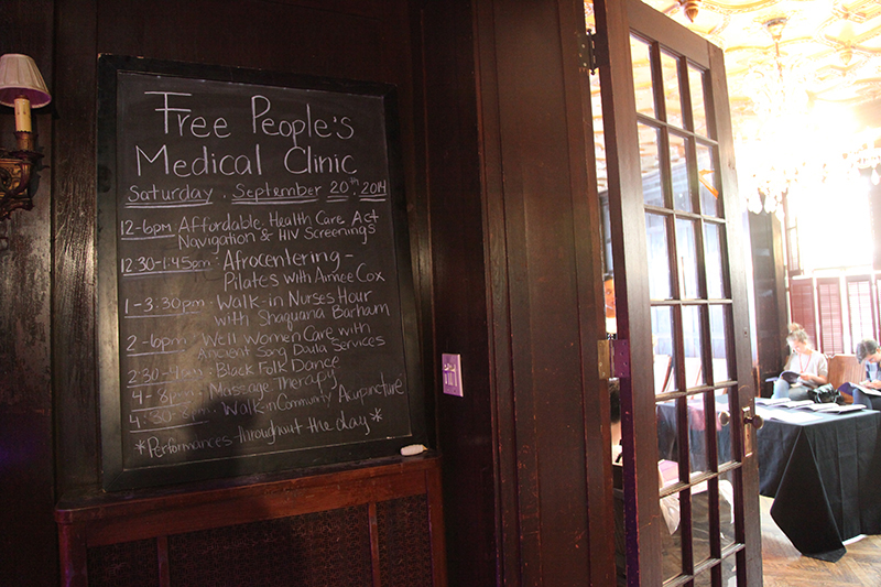 Leigh's work, Free People's Medical Clinic, was situated in a former mansion and combined performance, installation, and medical practice. Even with the midday heat, the mansion was dark and cool inside, low purple light and music beating through the space. Black women in nineteenth-century nurses uniforms offered to take one's blood pressure on the front stoop. Inside, black women at tables offered up the day's class schedule and the possibilities for care. I wandered through the mansion slowly. There was no aesthetic center, nothing exactly to look at. I watched people wandering in, many looking a bit uncomfortable in this still-black corner of Bed-Stuy, signing up for free acupuncture, yoga and dance classes, or ob-gyn care.